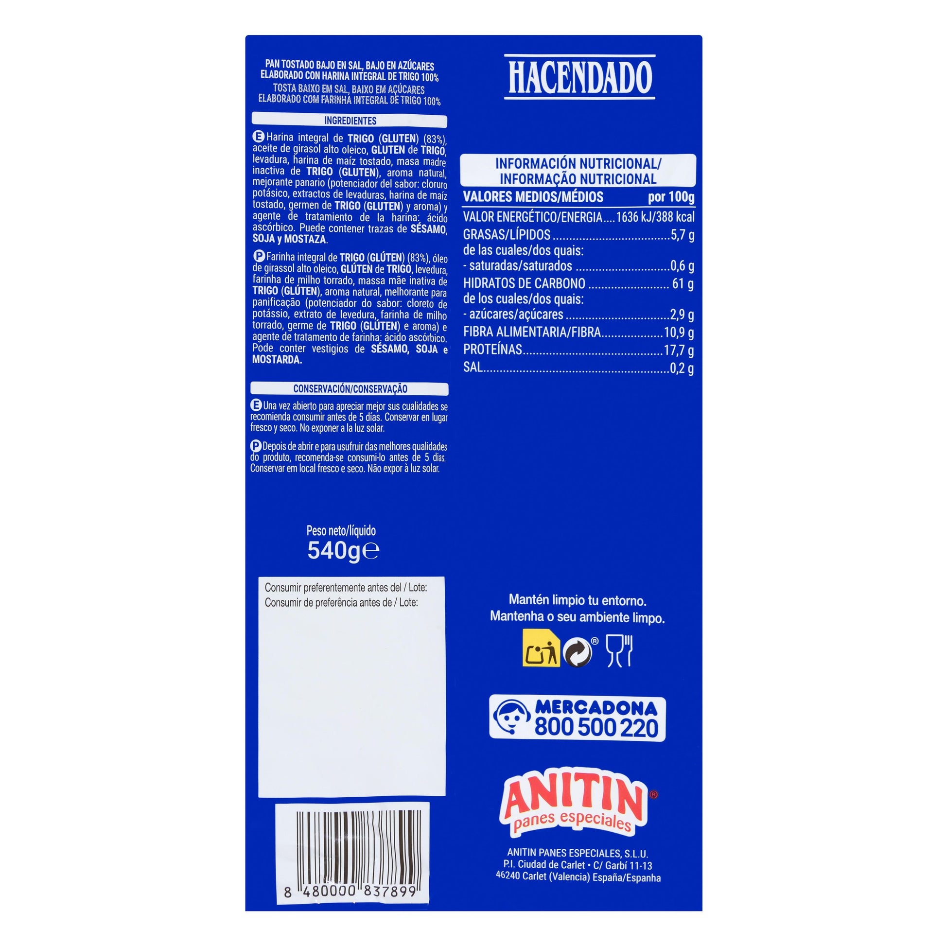 Pan Tostado 100% Integral Bajo en Sal y en Azúcares Hacendado