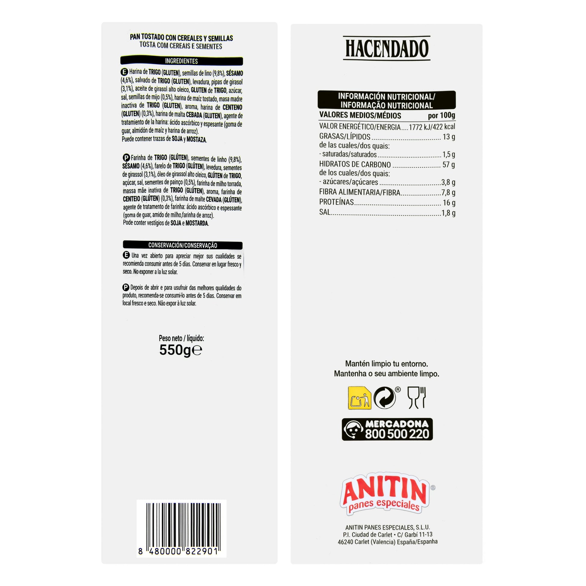 Pan Tostado Cereales y Semillas Hacendado